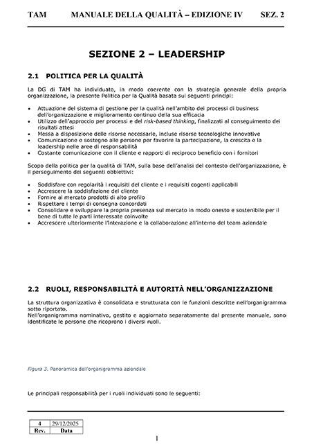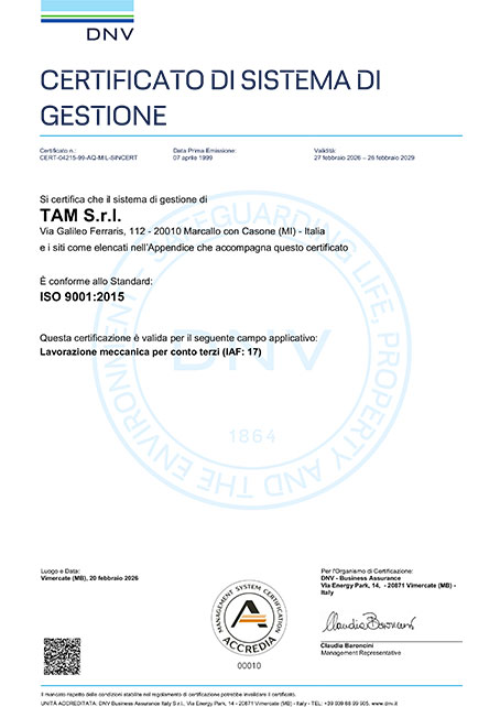 Per garantire continuità, solidità e flessibilità all'azienda, TAM S.r.l – Torneria Automatica Magentina - pone come priorità strategica la politica per la Qualità, intesa come miglioramento dei processi che coinvolgono l'organizzazione del ciclo produttivo, del ciclo di gestione e di amministrazione dell'azienda.